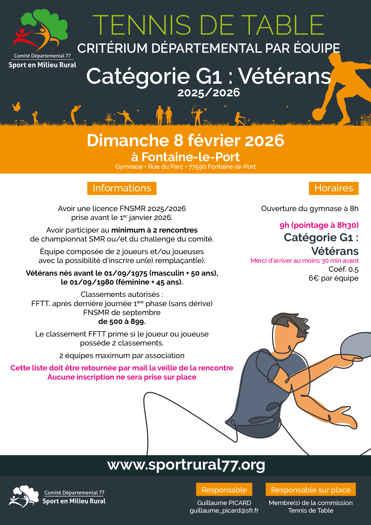 CDSMR 77 Mise à jour de l'article : 7 janv. 2026, 13:44 CRITÉRIUM DÉPARTEMENTALPAR ÉQUIPECatégorie G1 : Vétérans Dimanche 8 février 2026 à Fontaine-le-Port Affiche Inscriptions (PDF)