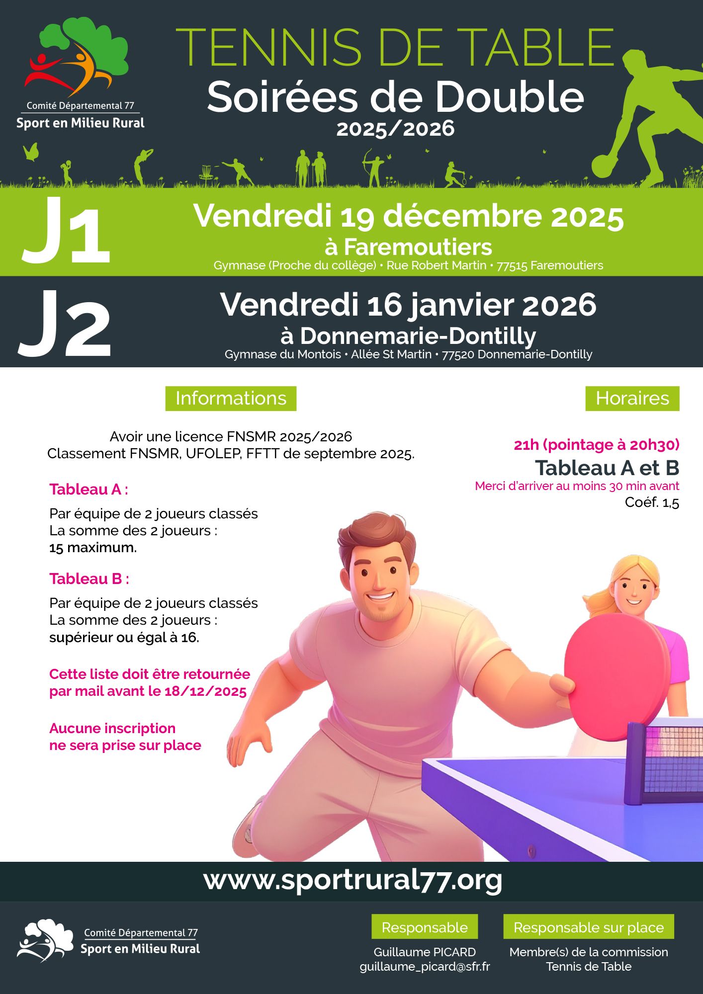CDSMR 77 Mise à jour de l'article : 1 déc. 2025, 21:03 Soirées de Double 2025/2026 Vendredi 19 décembre 2025à Faremoutiers Vendredi 16 janvier 2026à Donnemarie-Dontilly Affiche Inscriptions (PDF)